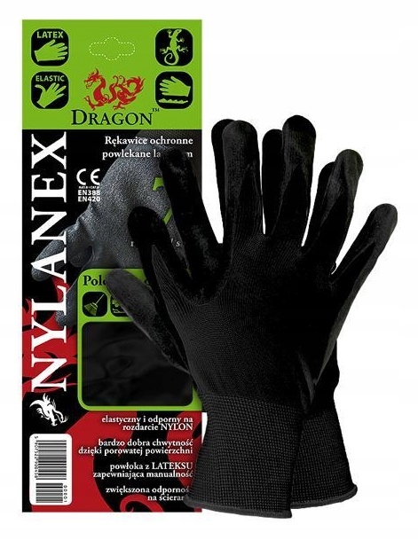 Lekkie i elastyczne rękawice ochronne, wykonane z wysokiej jakości nylonu o ściegu 13, zapewniają doskonałe dopasowanie do dłoni. Powłoka lateksowa o chropowatej strukturze gwarantuje pewny chwyt, nawet w przypadku mokrych lub tłustych powierzchni. Rękawice są odporne na rozdarcia, ścieranie i przebicia, jednocześnie zachowując wysoką elastyczność. Zakończone ściągaczem, doskonale przylegają do nadgarstka, chroniąc przed wnikaniem zanieczyszczeń.